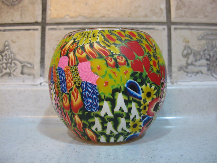 כדור זכוכית FIMO לתאורת נר דולק / פרחים ברקע שדה צהוב