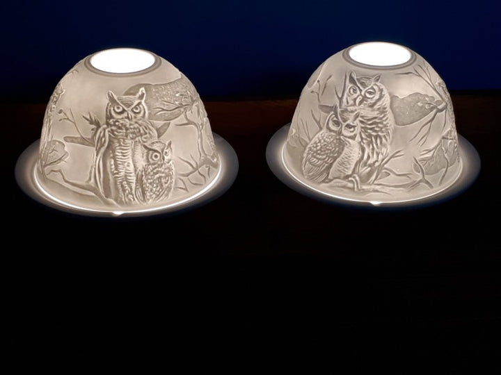 כוס פורצלן עם צלחת מוארת ע"י נר דולק / ינשופים