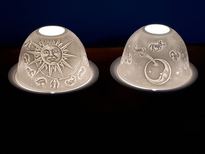 כוס פורצלן עם צלחת מוארת ע"י נר דולק / כוכבים אסטרולוגיה