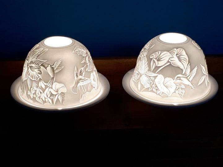 כוס פורצלן עם צלחת מואר ע"י נר דולק / ציפור יונק דבש