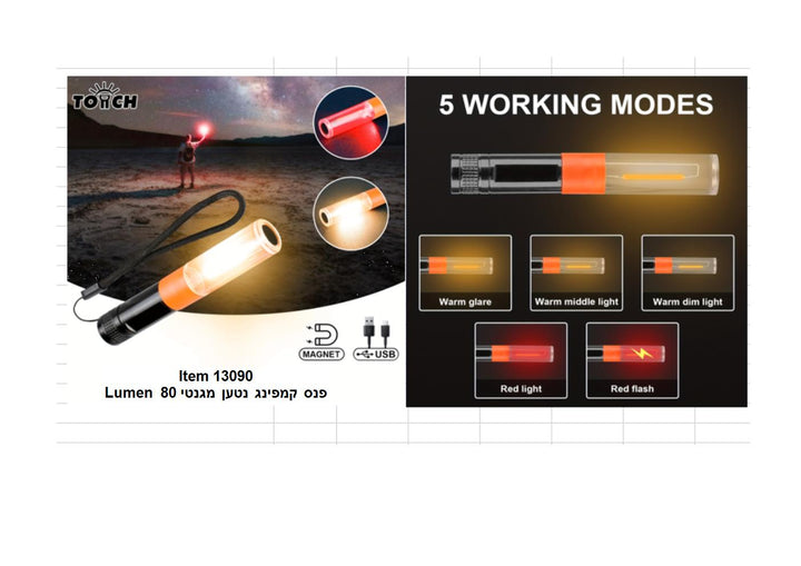 פנס נטען דמוי מבחנה מגנטי + אור אדום