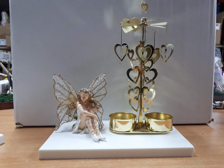 קרוסלה בזהב על בסיס שיש לבן עם פייה יושבת