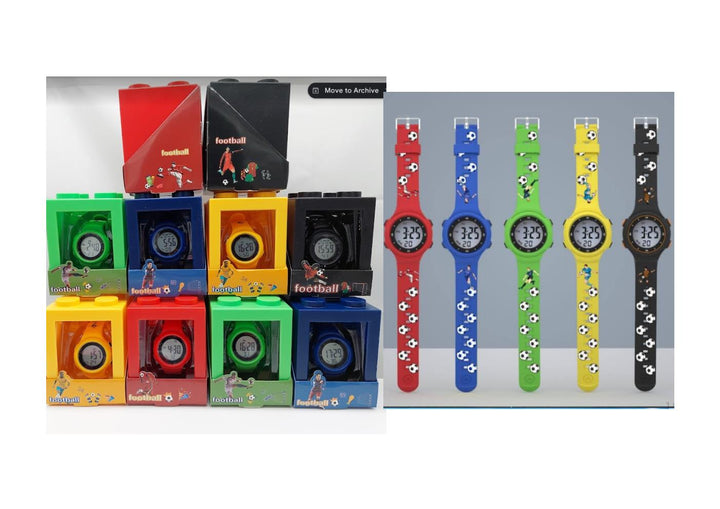 שעון יד דיגיטלי עם רצועה מודפסת בכדורגל במארז קופה מהודר