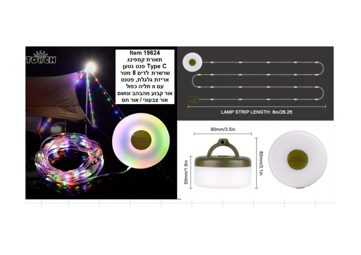 תאורת קמפינג פנס נטען+ גלגלת לדים 8 מטר אור חם/קר (YD-2314)